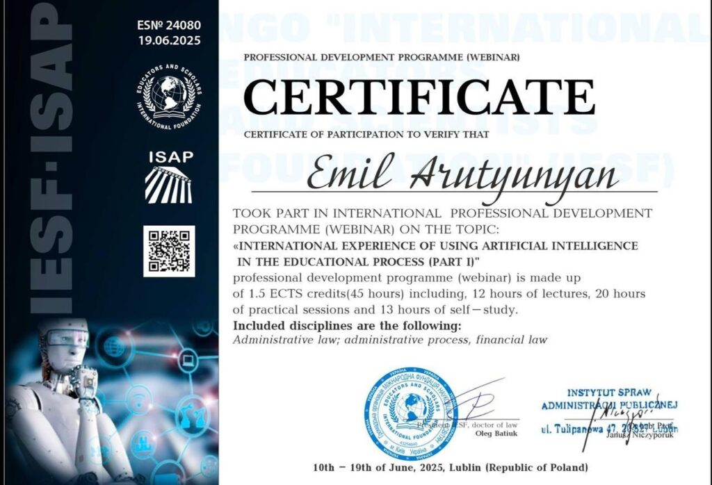 From June 10 to June 29, 2025, an International Webinar on Professional Development took place in Lublin, Poland, on the topic: “International Experience of Using Artificial Intelligence in the Educational Process.”
