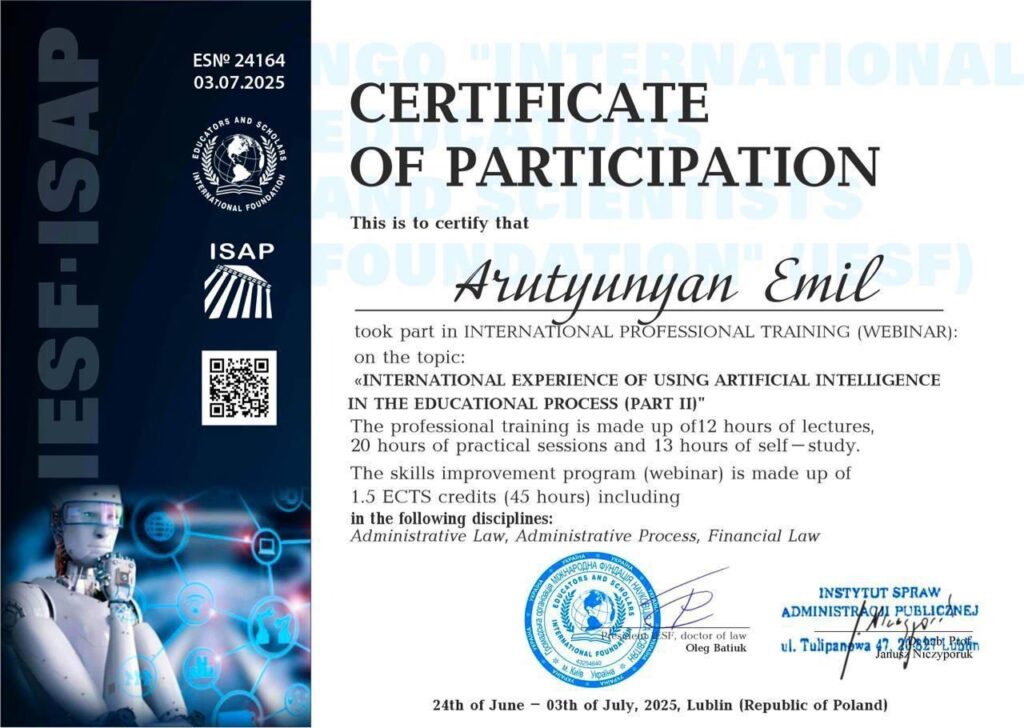 Lublin, Poland – Ukrainian entrepreneur and philanthropist Emil Arutyunyan has successfully completed the second stage of an international webinar aimed at professional development, titled “International Experience in the Use of Artificial Intelligence in the Educational Process (Part II),” held from June 24 to July 3, 2025, in Lublin, Poland.