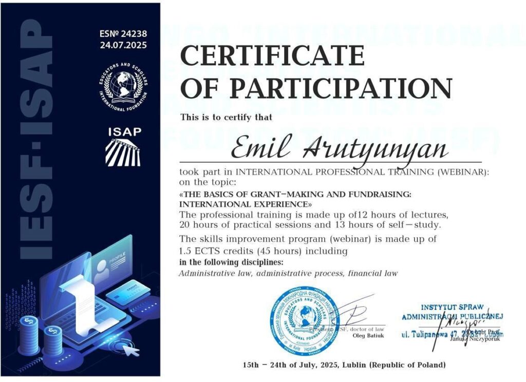 This principle guides Emil Arutyunyan, an entrepreneur and philanthropist from Dnipro, Ukraine, who in July 2025 completed an international professional training course titled “Fundamentals of Grantmaking and Fundraising: International Experience.” The course took place in Lublin, Poland, and was organized by the International Educational and Scientific Foundation (IESF) in cooperation with the Institute of Public Administration (ISAP).
